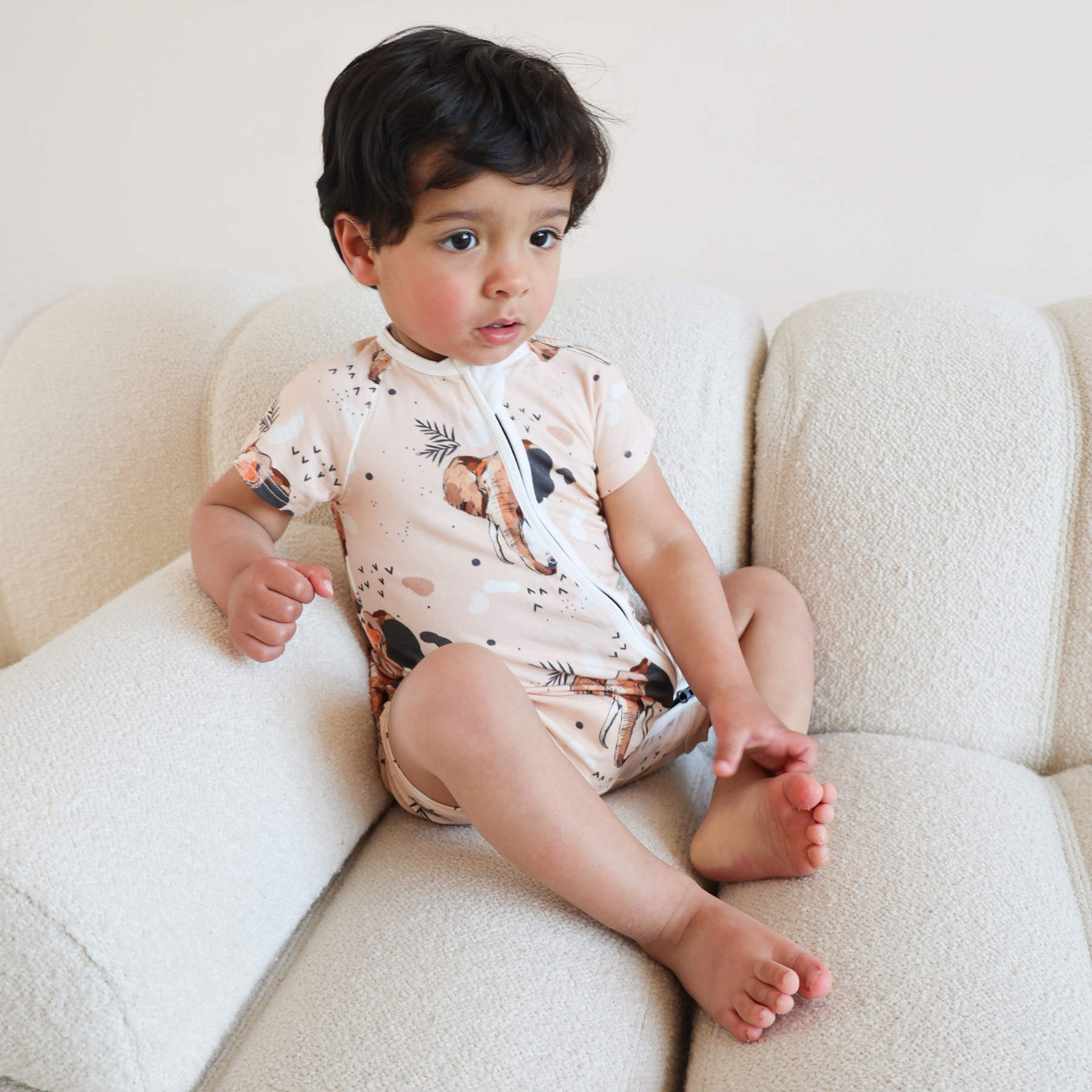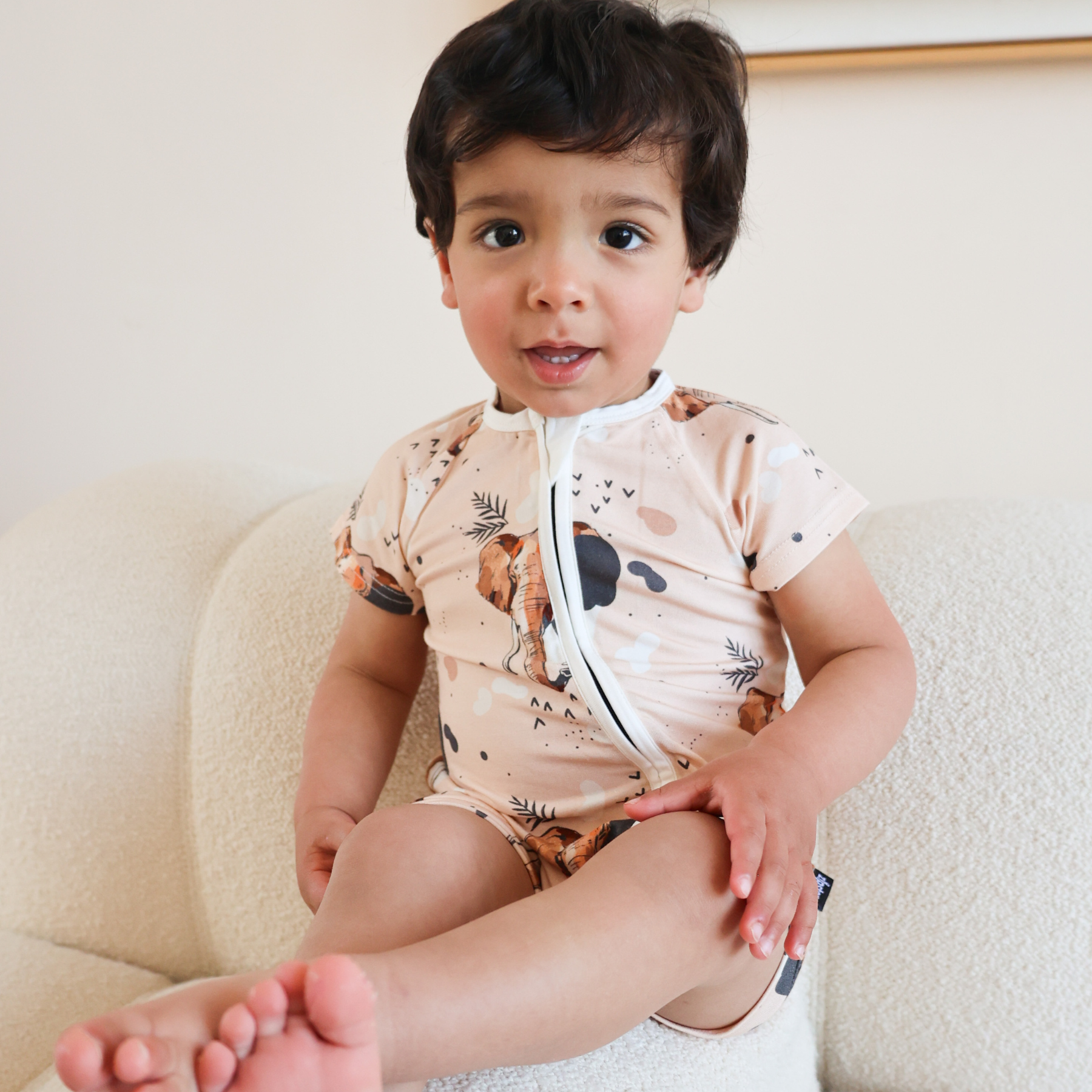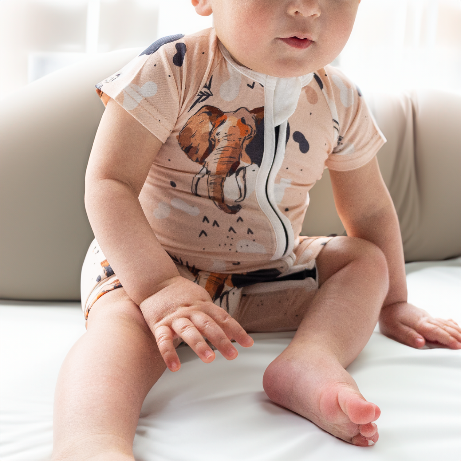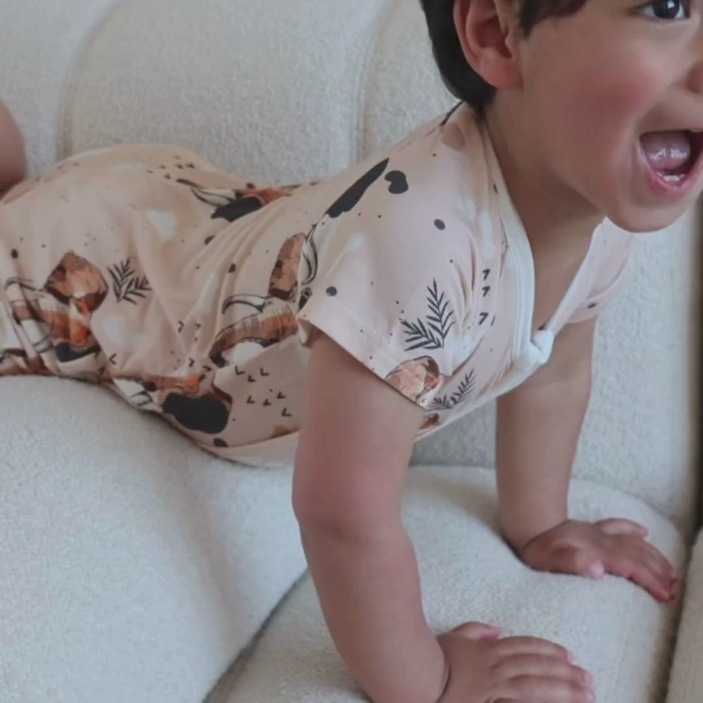 - Fremstillet af superblød og strækbar 95% bambus og 5% elastan. Det er skånsomt mod din babys hud og perfekt hele året rundt på grund af dets kvaliteter. Se, hvorfor vi elsker bambus her.